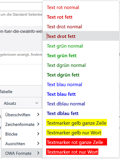 Im Contao-Texteditor sind für Textelemente unter [Absatz] (rechts) OWA Formate mit korrekten Farben wählbar.
