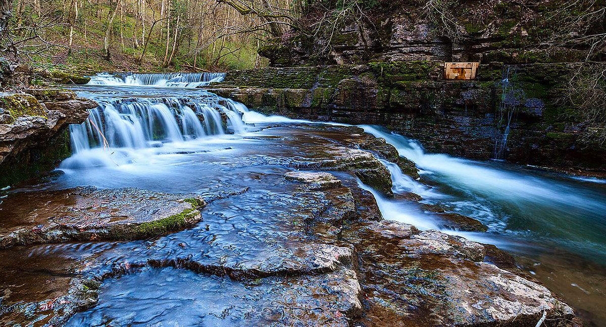 Wir folgen zunächst weiter dem Pfad in die Schlichemklamm. An der Weggabelung halten wir uns immer rechts im Tal in Richtung Irslingen. Die Klamm fängt gleich danach recht beeindruckend an: Das Wasser rieselt und sprudelt über terrassenartig geschichtete Steinbänke, die wie gemauert aussehen. Am meisten Wasser führt der Bach im Frühjahr und nach starken Regenfällen. Auch der Weiterweg ist wildromantisch: Immer wieder gibt es im Bachbett kleine Terrassen, daneben mächtige Felswände und beeindruckende Szenerien mit quer liegenden Bäumen.