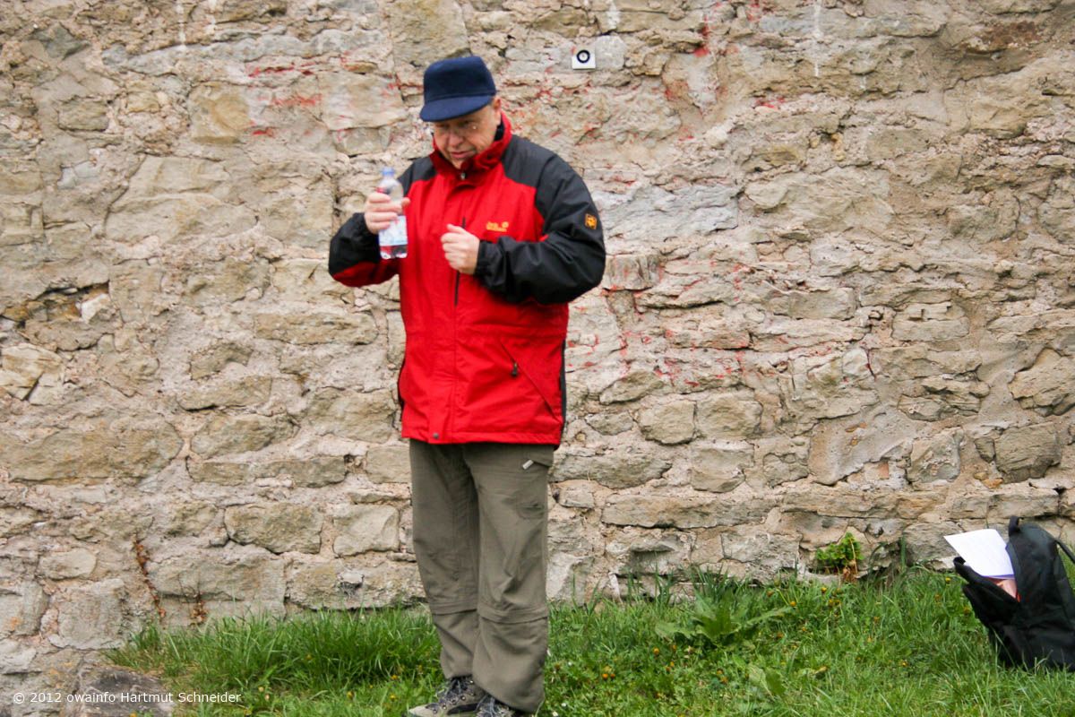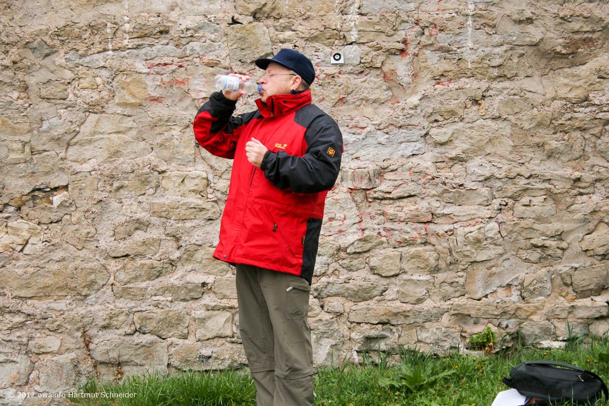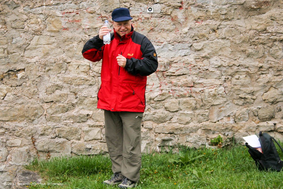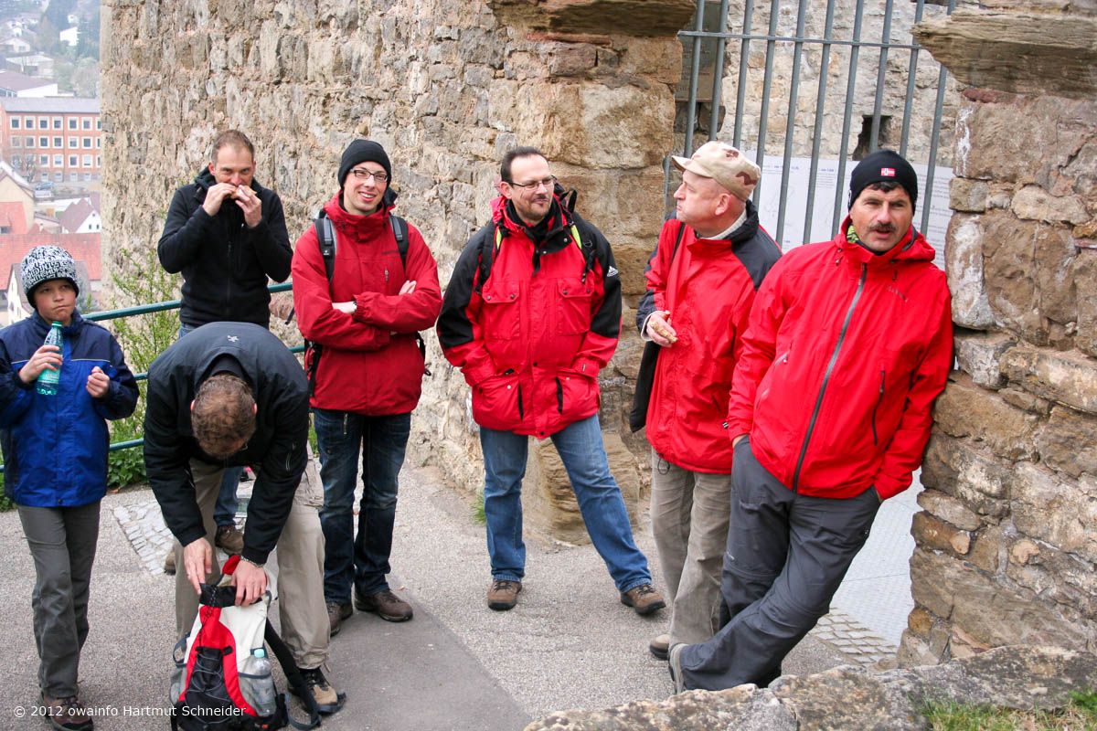 Weiter gehts auf der Hochebene, vorbei am Sendemast Mühlacker (368 m hoch) zu der erst vor kurzem völlig ausgegrabenen Burgruine Löffelstelz auf einem Felsen hoch über der Enz. Hier hält Rudi seine berühmt-berüchtige OWA-Begrüßungsrede...