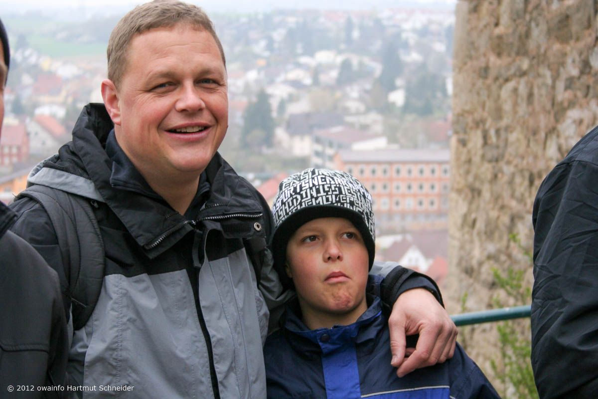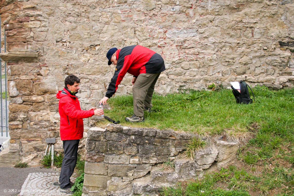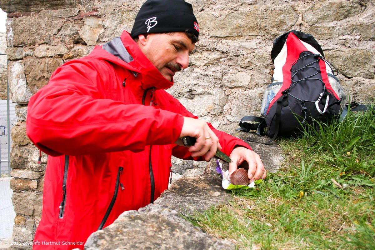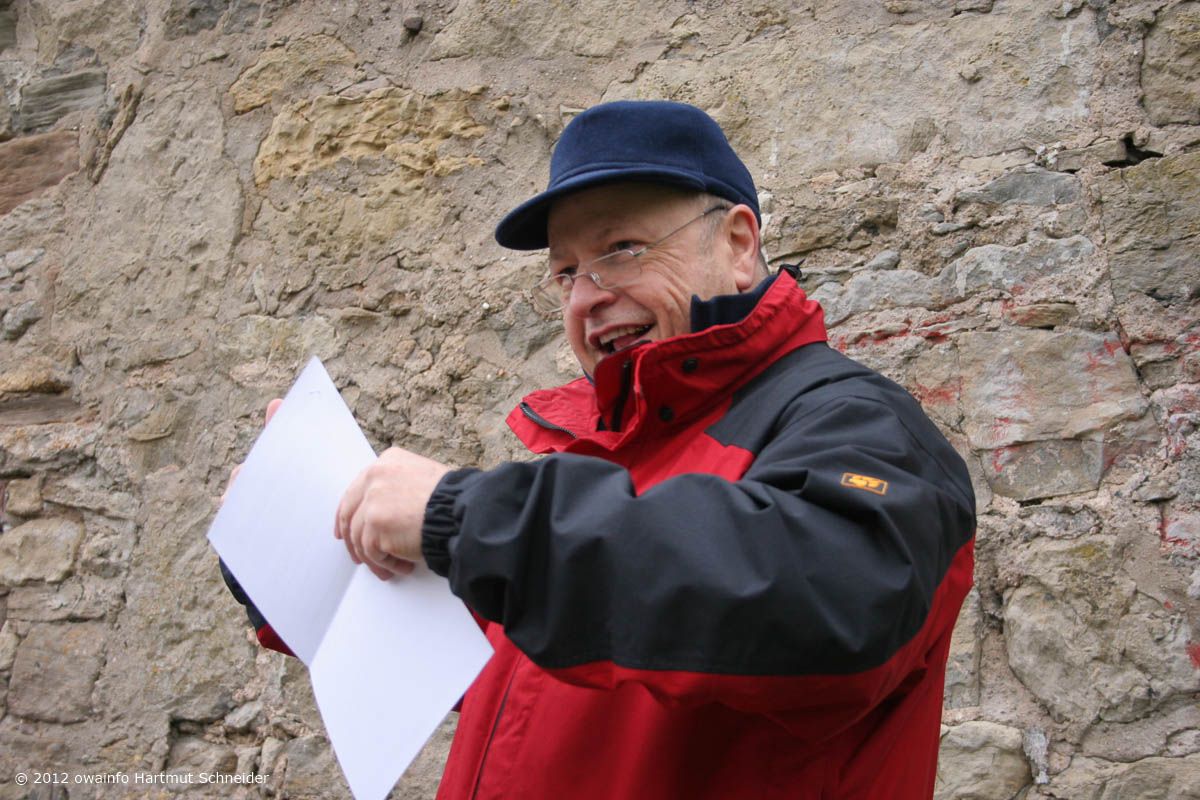 Weiter gehts auf der Hochebene, vorbei am Sendemast Mühlacker (368 m hoch) zu der erst vor kurzem völlig ausgegrabenen Burgruine Löffelstelz auf einem Felsen hoch über der Enz. Hier hält Rudi seine berühmt-berüchtige OWA-Begrüßungsrede...
