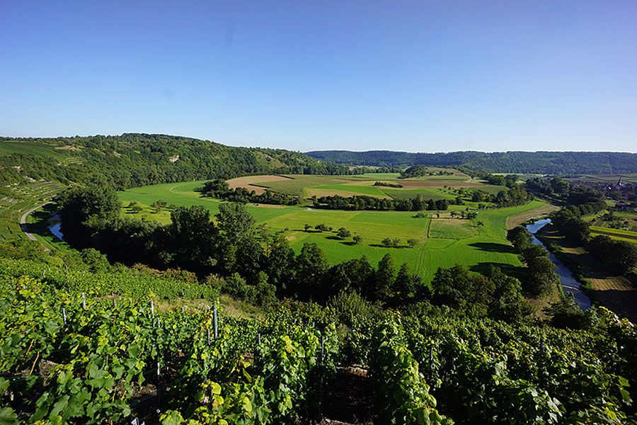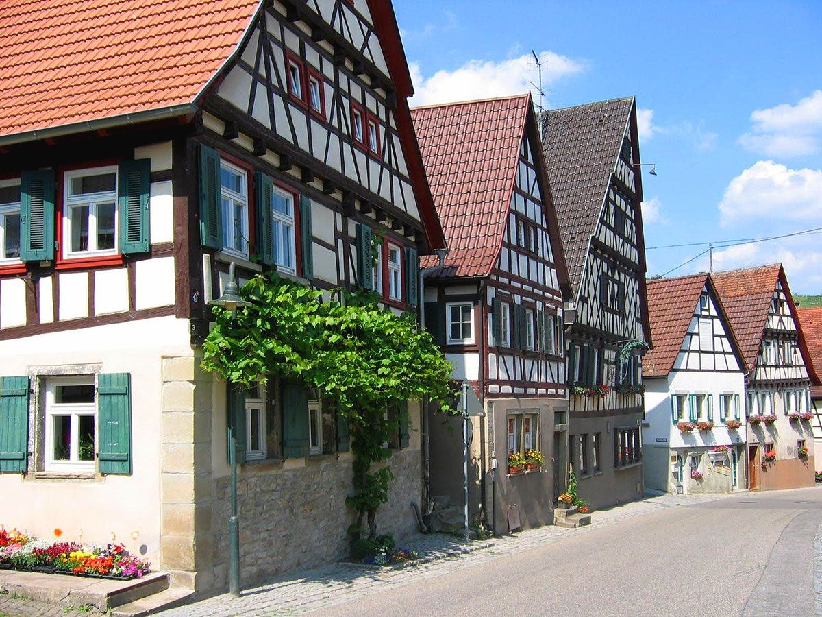 Der Ort war mit seinen Spitzenweinen einst Hoflieferant der herzoglichen Tafel in Stuttgart. Wir betrachten die aufwändigen Fachwerkhäuser beim Durchstreifen auf verschlungenem Pfad und gelangen so zur den Ort dominierenden wehrhaften mittelalterlichen Kirche mit der Möglichkeit zu einer kurzen Rast.